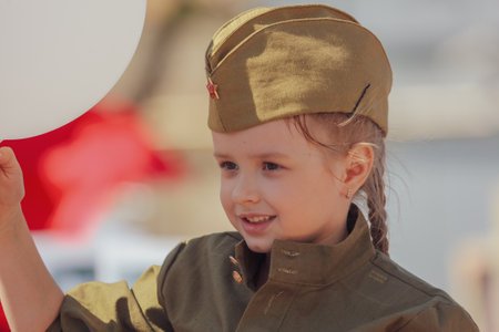 Portrait of a russian child girl in uniform. Holiday Victory Day May 9th