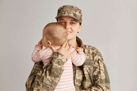 Portrait of happy reunion of female soldier with her cute toddler daughter, mommy hugging her infant baby girl, being happy to meet her charming kid in striped sleeper.