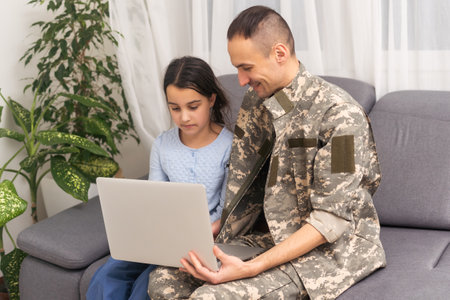 Happy military man smiling and hugging his family while using laptop indoors