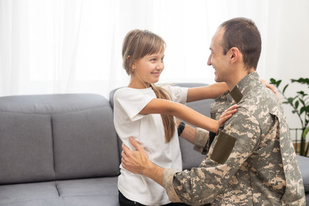 Masculine sad military man hugging her upset daughter indoors