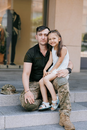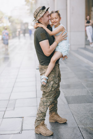 Ukrainian soldier returning from the war meets his little daughter and joyful embraces her. War in Ukraine. Russian military invasion in Ukraine. War and children.
