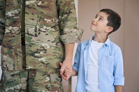 Kid staring at father in military with pride