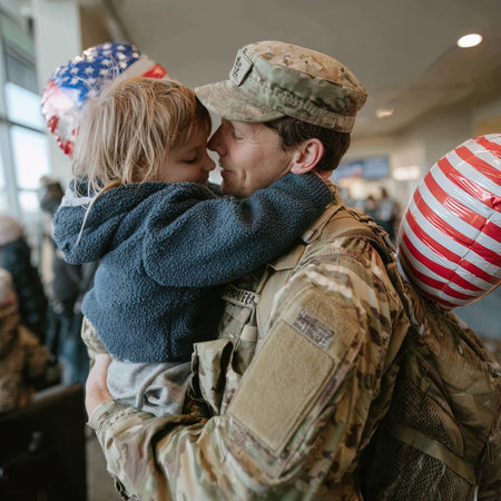 Soldier returning home, holding his son in his arms