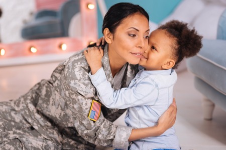 Feeling truly relieved. Military officer feeling truly relieved coming back home after service and playing with daughter