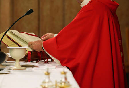 bishop with red cassock while celebrating mass while reading the bible in church