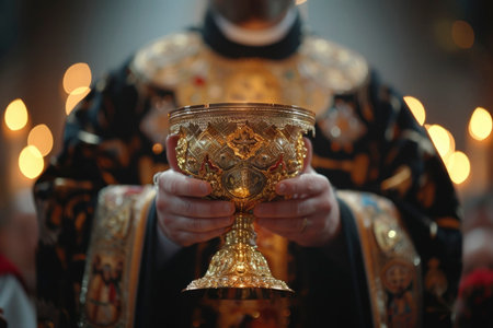 A close-up view of an individual holding a golden chalice while reviewing an important document, creating an atmosphere of significance and tradition.