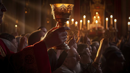 During an evening service, a priest performs the sacred Eucharist ceremony at a richly adorned church filled with warmth and reverence