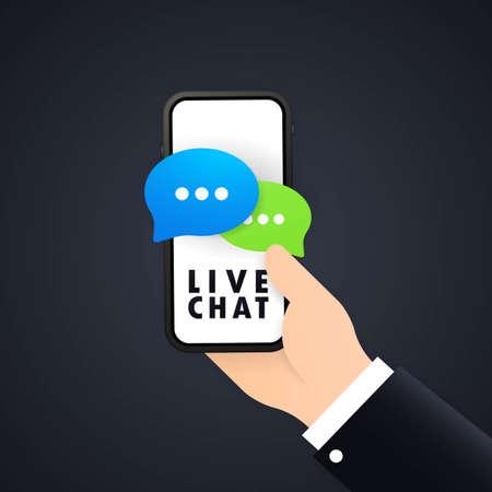 Live chat banner. Hand holding phone in hand with message icon. Communication. Conversation sign. Vector on isolated white background. EPS 10