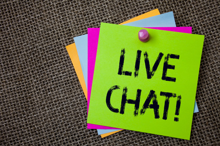 Handwriting text writing Live Chat Motivational Call. Concept meaning Real time media conversation Online communicate Sticky cards board pinned muliple colours remember idea jute background
