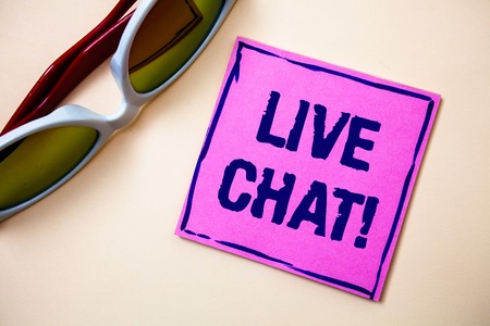 Conceptual hand writing showing Live Chat Motivational Call. Business photo text Real time media conversation Online communicate Sticky cards googles glasses office smart script work eye sight