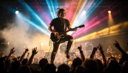 Energetic concert guitarist in sharp view colorful stage effects and excited fans blending into a smooth bokeh background.