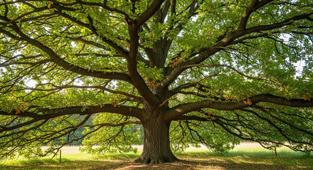 A majestic oak tree stands proudly with its sprawling branches, illuminated by soft sunlight filtering through lush leaves, creating a serene atmosphere.