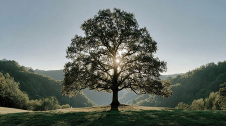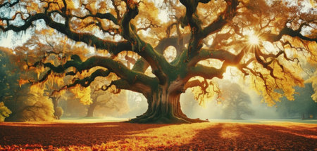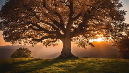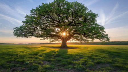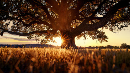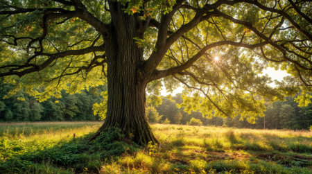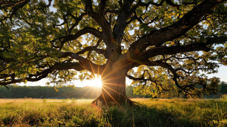 Majestic oak tree with golden sun radiating through its leaves, creating warm and inviting atmosphere. scene captures beauty of nature at sunset, highlighting vibrant colors and serene landscape