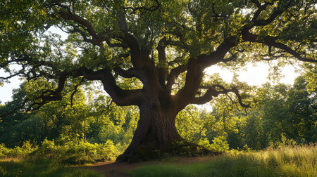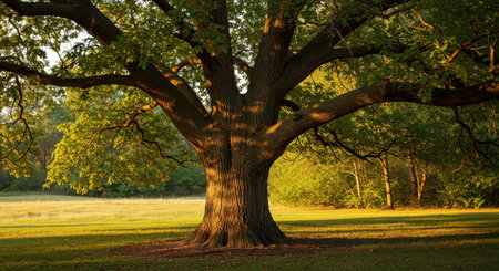 A majestic oak tree stands proudly with expansive branches, bathed in golden sunlight, creating a serene and inviting atmosphere in the natural landscape.