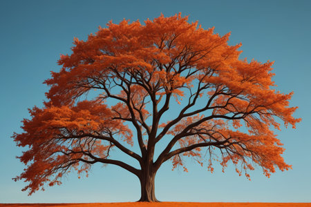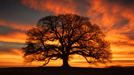 A splendid oak tree showcases its fiery autumn foliage under the warm glow of the setting sun