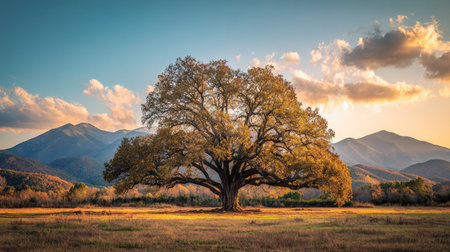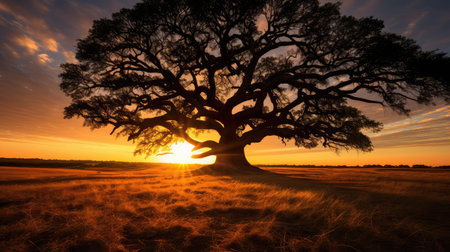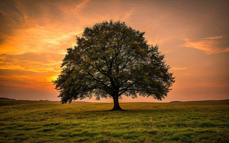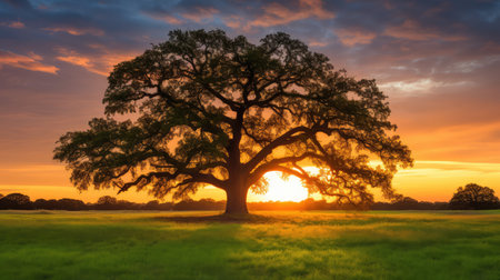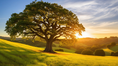 Large oak tree with lush green leaves stands majestically in golden field, illuminated by warm glow of setting sun. serene landscape evokes sense of peace and tranquility