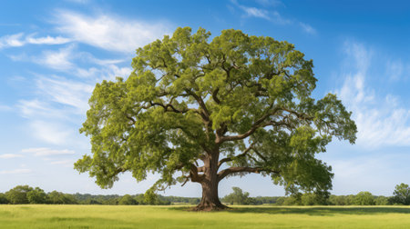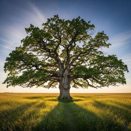 A large oak tree with sprawling branches basking in the warm sunlight, standing tall in a peaceful meadow.