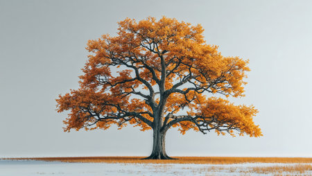 Stunning golden foliage on a tree creates a vibrant contrast against the serene winter landscape. Ai generated image