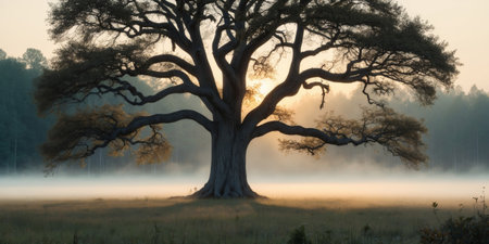AI Generated. Majestic tree standing in a tranquil forest at dawn