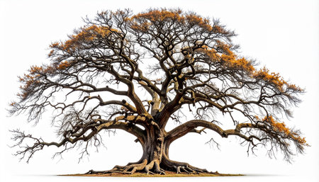Majestic oak tree with sprawling branches and golden leaves under a bright blue sky, evoking a serene autumn feel
