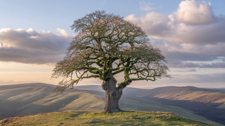 Experience the serene beauty of a majestic lone tree with sprawling branches standing in a tranquil landscape, basking in warm sunlight during golden hour, evoking peace.