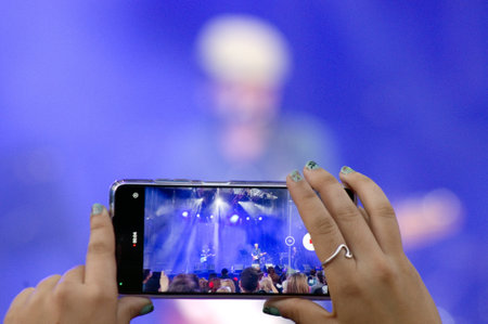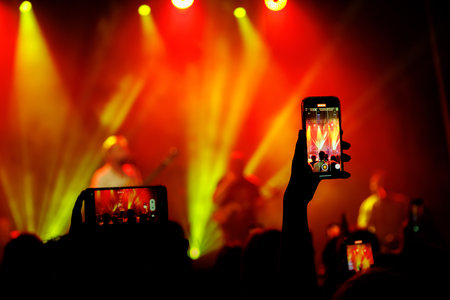 Krakow, Poland - September 20, 2014: Abstract background art of a cellphone camera capturing an artist performing rock music concert.