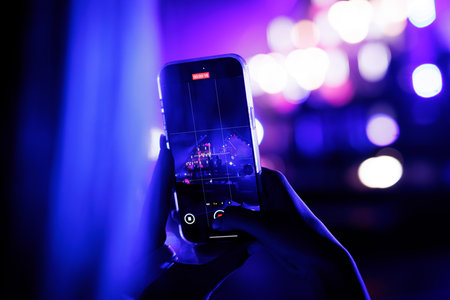 Sharing Concert Experience Smartphone Recording Live Music Performance Under Vibrant Stage Lights