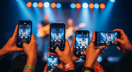 Audience at event uses smartphone camera to take photos and videos and live broadcasts