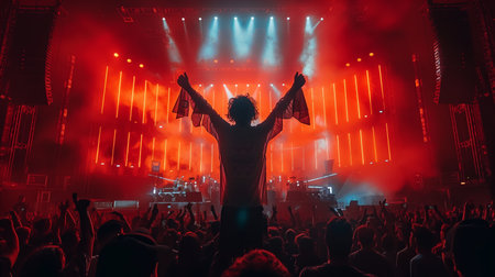 Stage lights and crowd of audience with hands raised at a music festival. Fans enjoying the party vibes.