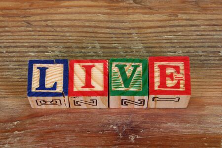 Two wooden blocks spell LIVE MUSIC. The blocks rest on a textured, woven turquoise backdrop. It evokes feelings of fun, excitement, and the joy of experiencing musical performances