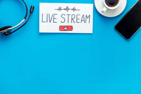 Online streaming social media concept. Paper tablet on office desk top view