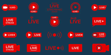 Live Stream Sign Set. Online News, Show, Channel Television. Live Stream Line Icon. Online Broadcast Buttons Pictogram. Red Symbol of Livestream. Isolated Vector Illustration