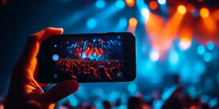 A person taking photo or video with his smartphone during a concert or a performance.