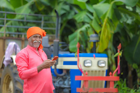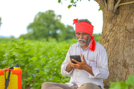 Indian farmer using mobile phone at Agriculture field