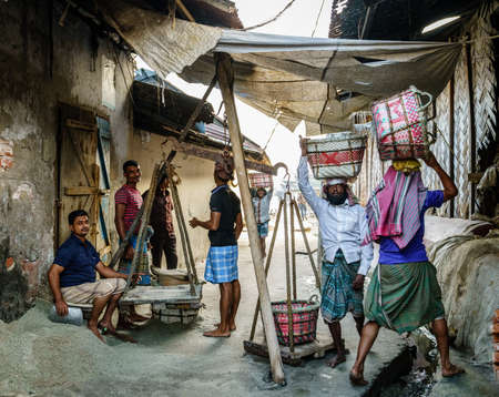 Chittagong, Bangladesh, December 22, 2017: Men weighing baskets with salt at a factory in Chittagong, Bangladesh