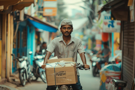 Focused delivery man riding a motorcycle through a bustling city street