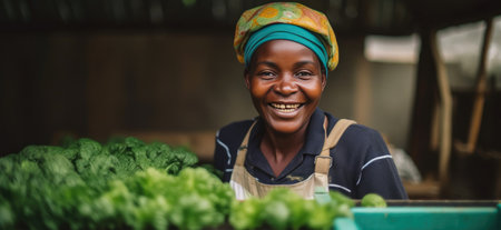 Joyful African Farmer Showcasing Organic Vegetable Harvest in Hydroponics Greenhouse. Generative AI