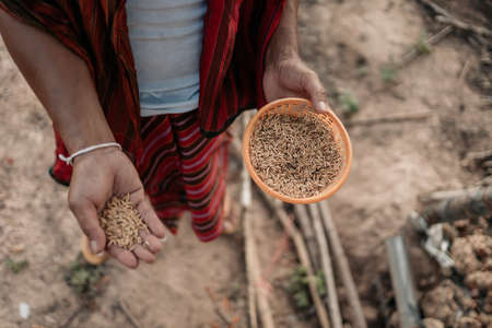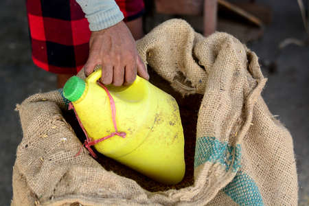 worker labor prepare paddy rice from hemp sack to produce