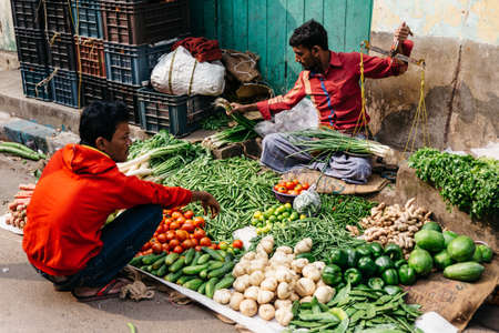 Vegetable merchant sell a bunch of spring onion that weigh by scales in the morning market in Kolkata, India.