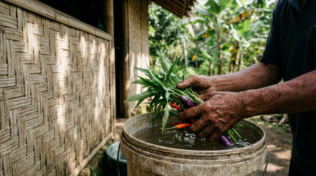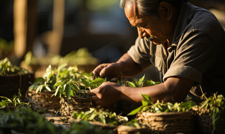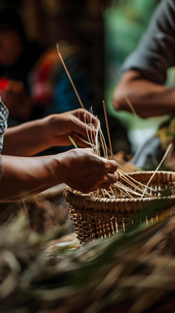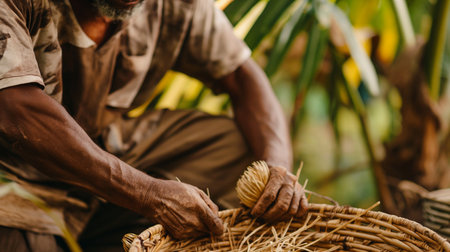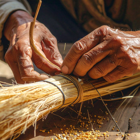 With weathered hands that hold generations of knowledge, an artisan carefully binds together stalks of straw.
