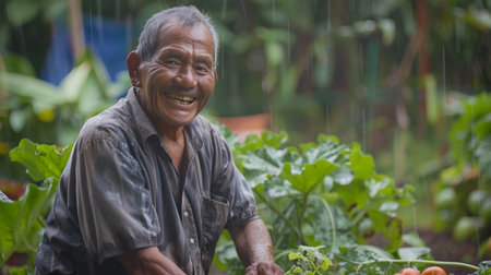 A man smiles contentedly as he tends to his garden, relishing the nourishment provided by the rain.
