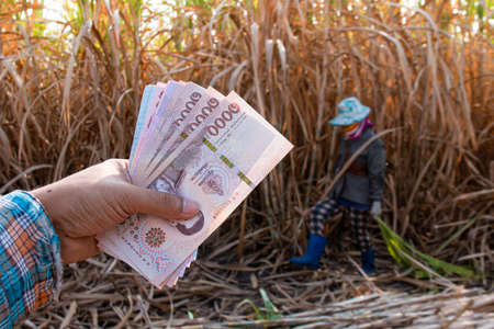 money in hand sugarcane farmers, banknote money thai baht in the hand at sugarcane plantation field in sugar cane harvest season