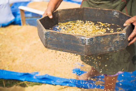 Wheat harvest in village on field. Farmers manually clean the harvested grain. Rural agriculture background.