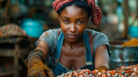 African woman sells multicolored beans and seeds at market with vibrant dress on