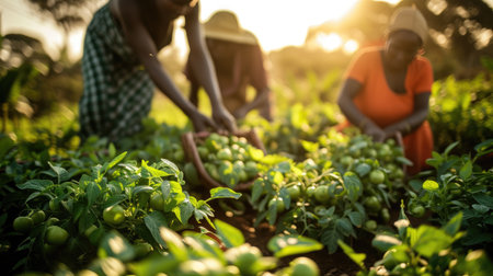 Multi-racial farmers working together in a lush field, harvesting crops as a community, promoting sustainability.