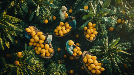 Top view of a group of young farmers harvesting oranges on the field.