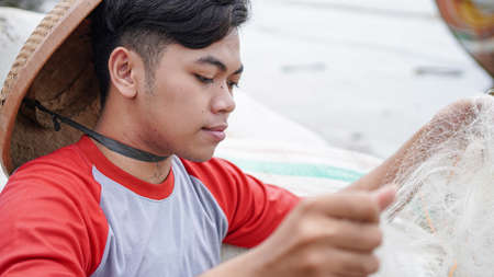 Portrait of a young male fisherman preparing a fishing net in beach