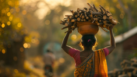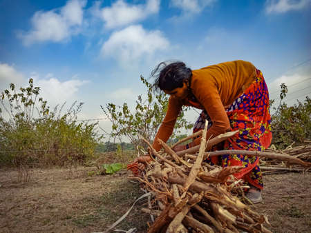 DISTRICT KATNI, INDIA - JANUARY 01, 2020: An indian village lady labour binding wooden fire sticks on forest area at blue sky background.