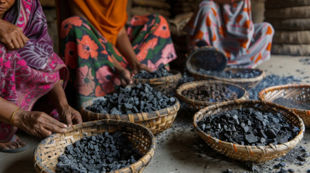 Women sit on the ground using simple handwoven baskets to sift through the dried charcoal and remove any large chunks or impurities