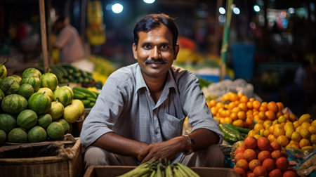 Vibrant street market scene with vendor among fruits vegetables and textiles